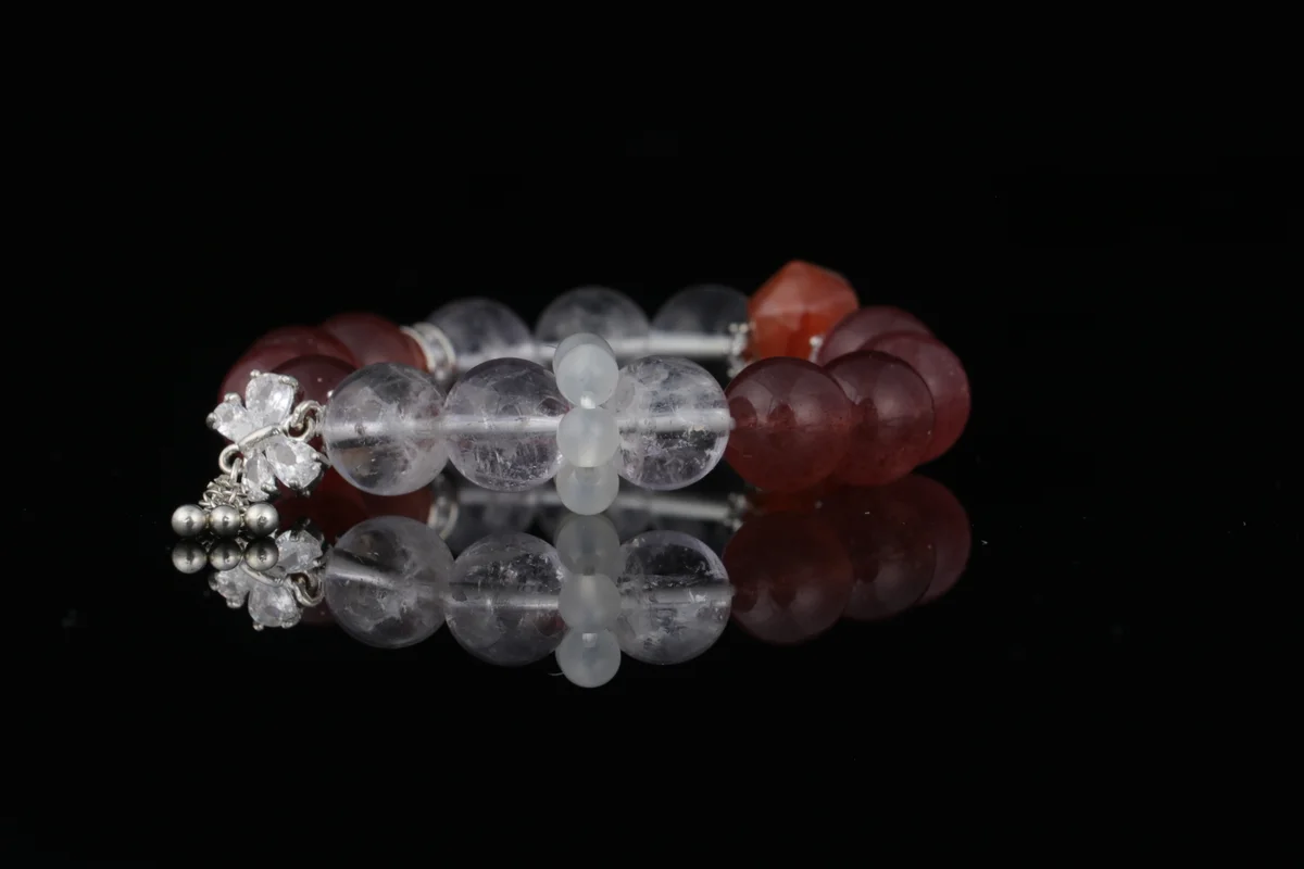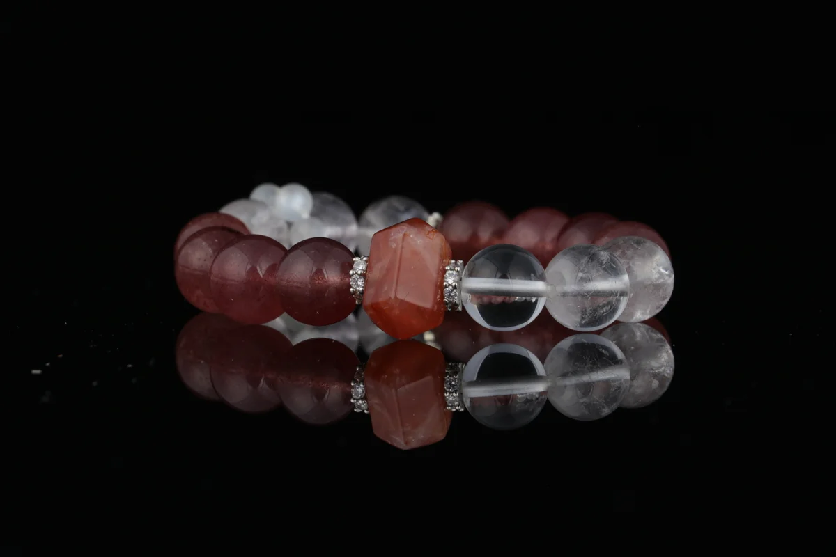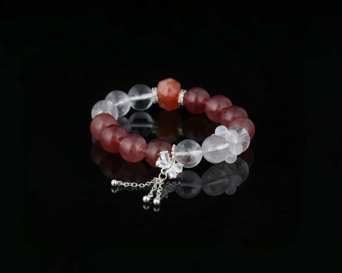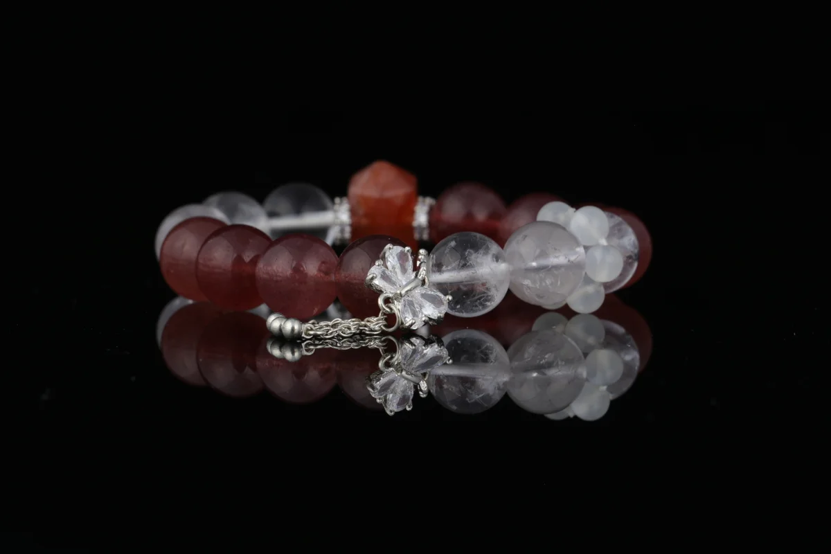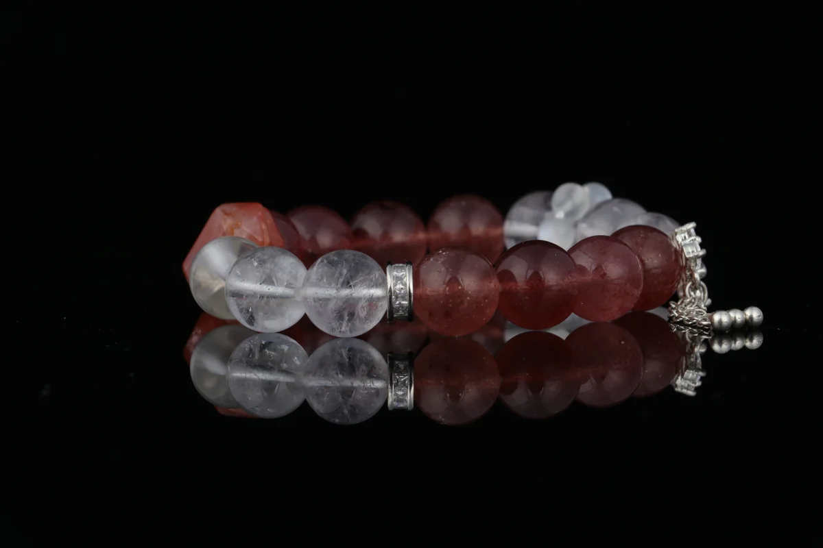 這款手鍊結合了天然草莓晶和白水晶的雙重能量,主要功效包括招正緣桃花、旺人緣貴人運。草莓晶對應心輪,能增強個人魅力與親和力;白水晶則淨化負能量,放大美好頻率。雙石能量疊加,有助於吸引良緣、改善人際關係,使職場社交更順利。此外,它還能根據生辰定制專屬能量,通過左進右出的佩戴方式,實現招財納福的效果。