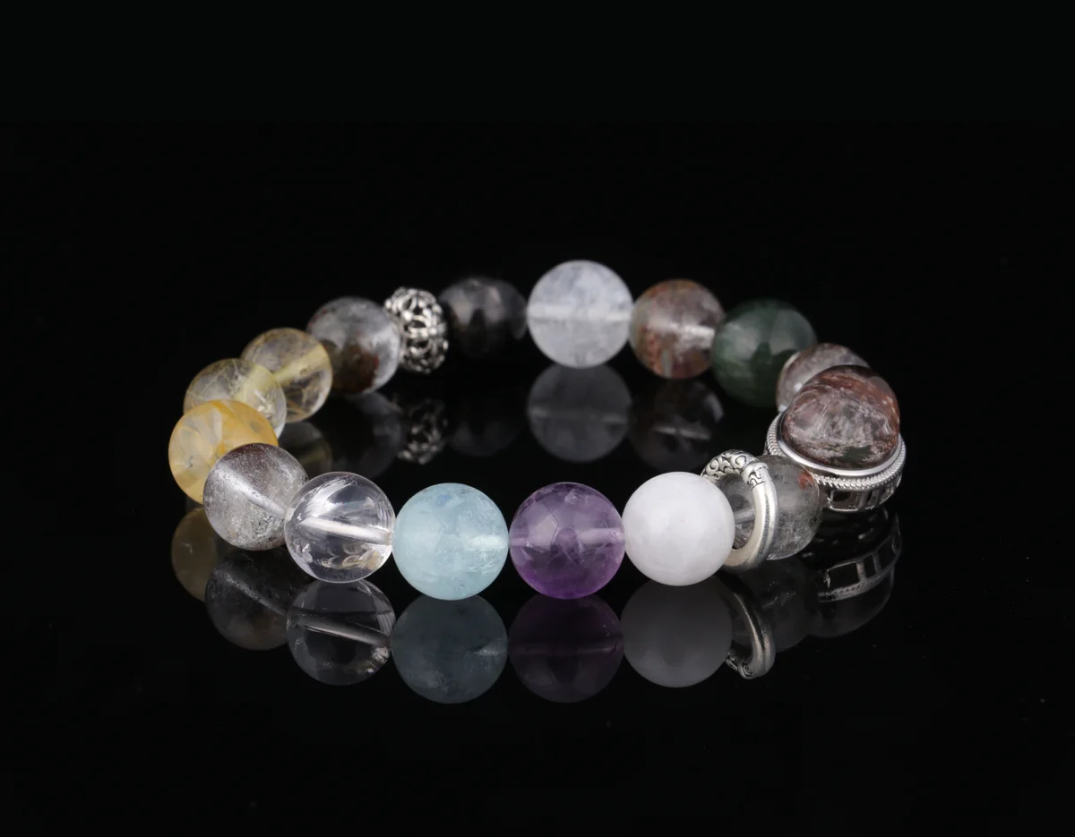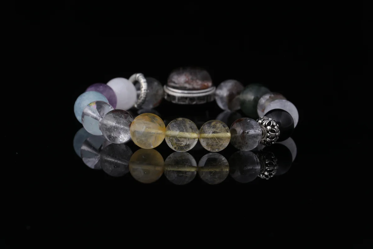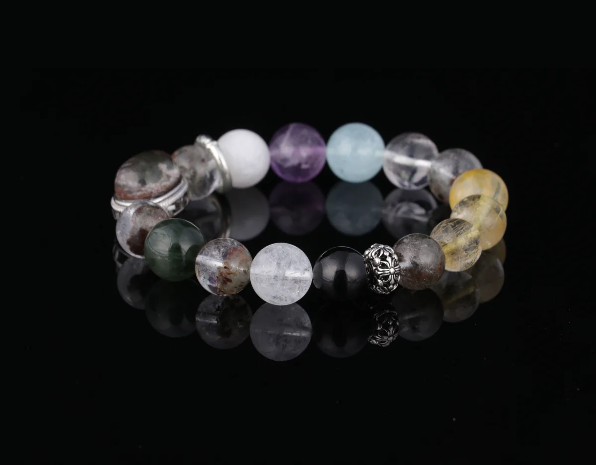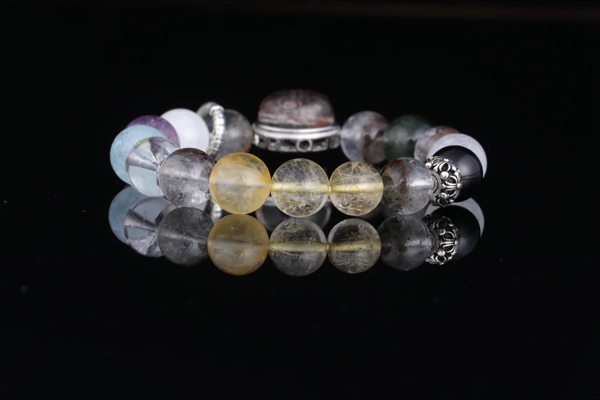 這款天然水晶手鍊集結花幽靈、海藍寶、紫晶、金髮晶四大能量石,具有多重核心功效:花幽靈旺事業,海藍寶助溝通,紫晶增智慧,金髮晶招偏財。整體專為招財轉運、改善睡眠、提升氣場而設計,適合上班族職場開運、失眠者枕邊安神、生意人招財納福。每顆水晶均為天然原礦,對應五行平衡,能有效吸收能量,帶來綜合益處。