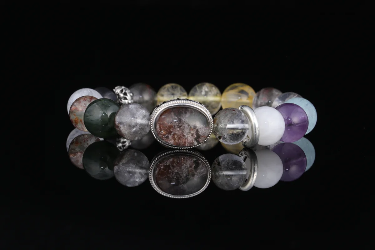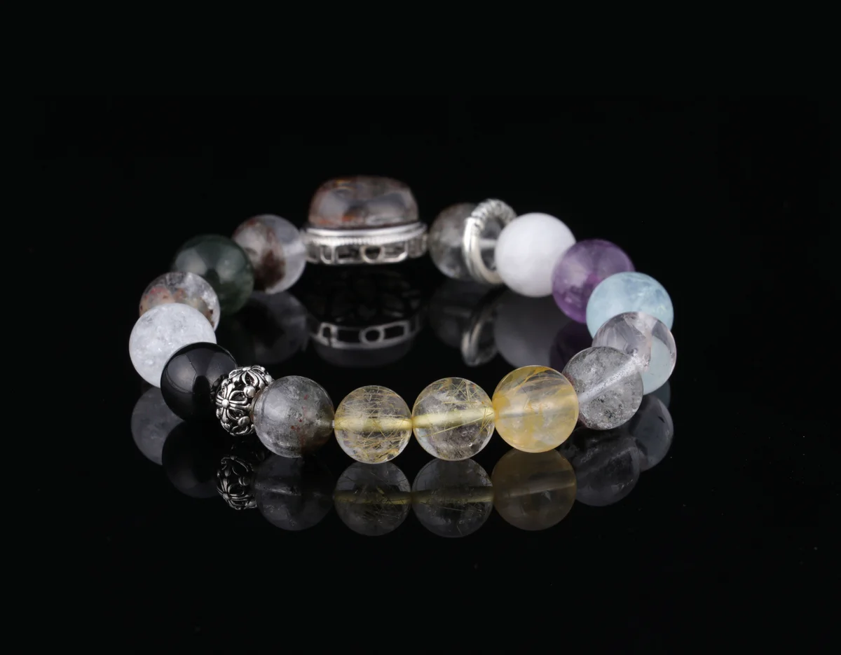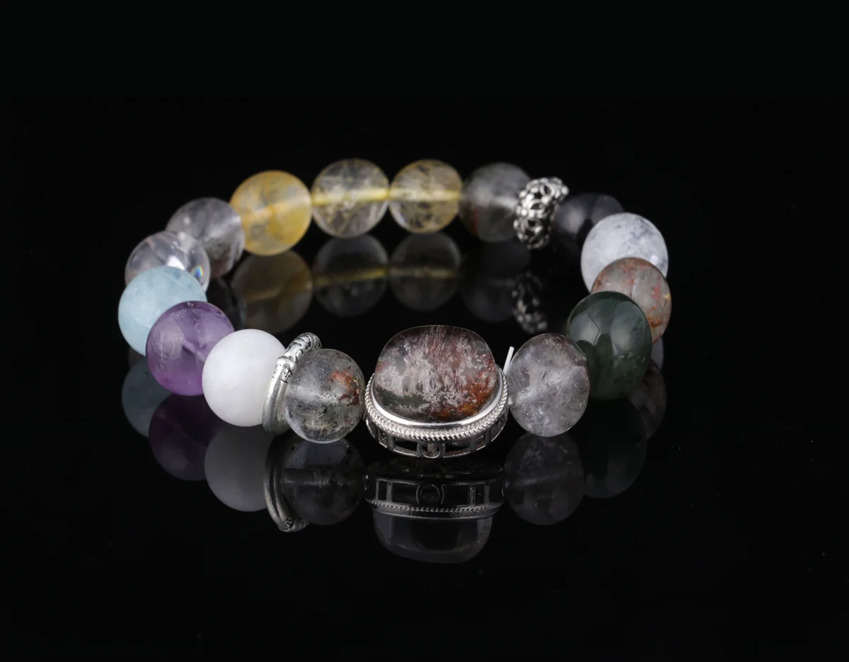 這款天然水晶手鍊集結花幽靈、海藍寶、紫晶、金髮晶四大能量石,具有多重核心功效:花幽靈旺事業,海藍寶助溝通,紫晶增智慧,金髮晶招偏財。整體專為招財轉運、改善睡眠、提升氣場而設計,適合上班族職場開運、失眠者枕邊安神、生意人招財納福。每顆水晶均為天然原礦,對應五行平衡,能有效吸收能量,帶來綜合益處。
