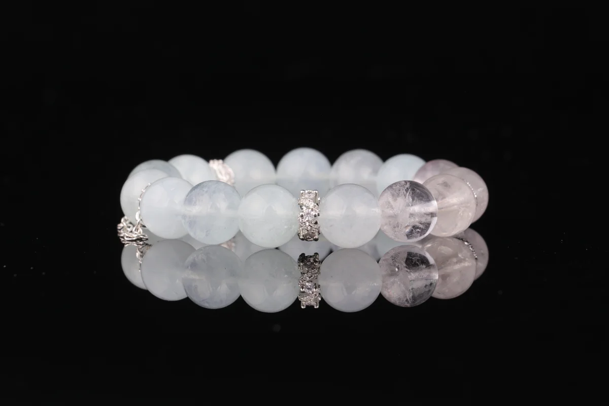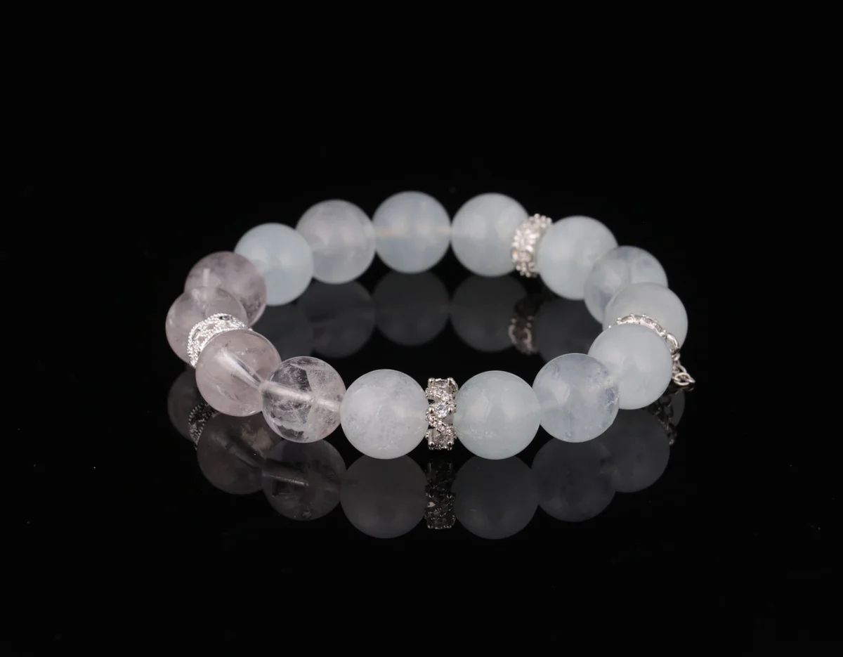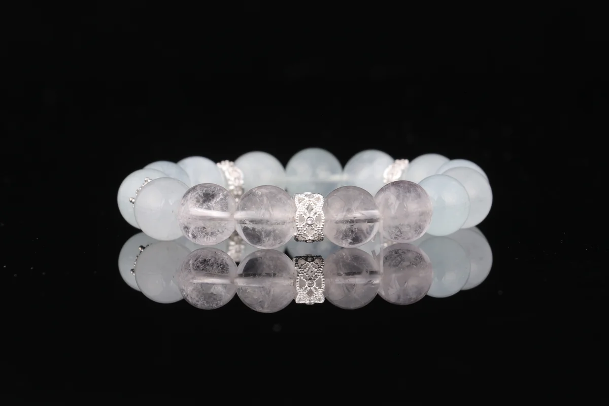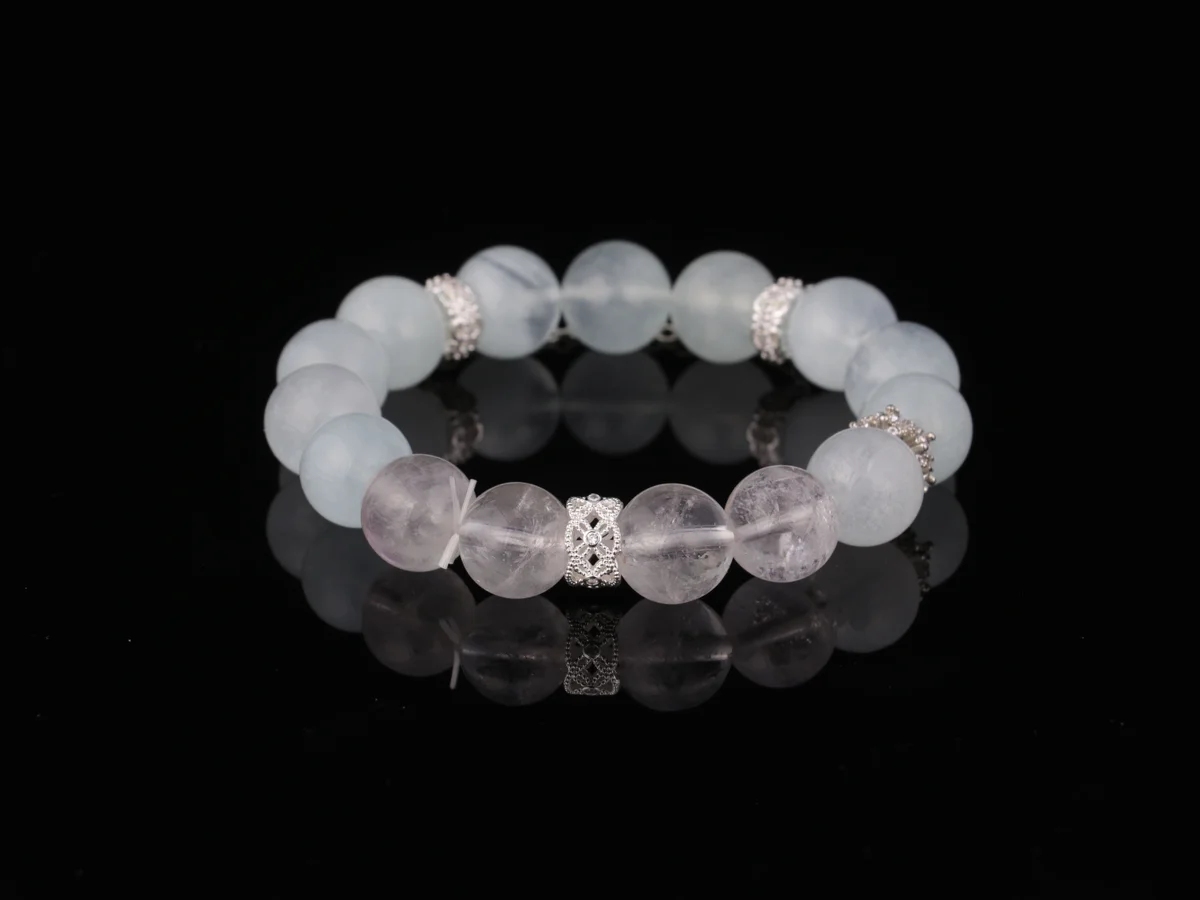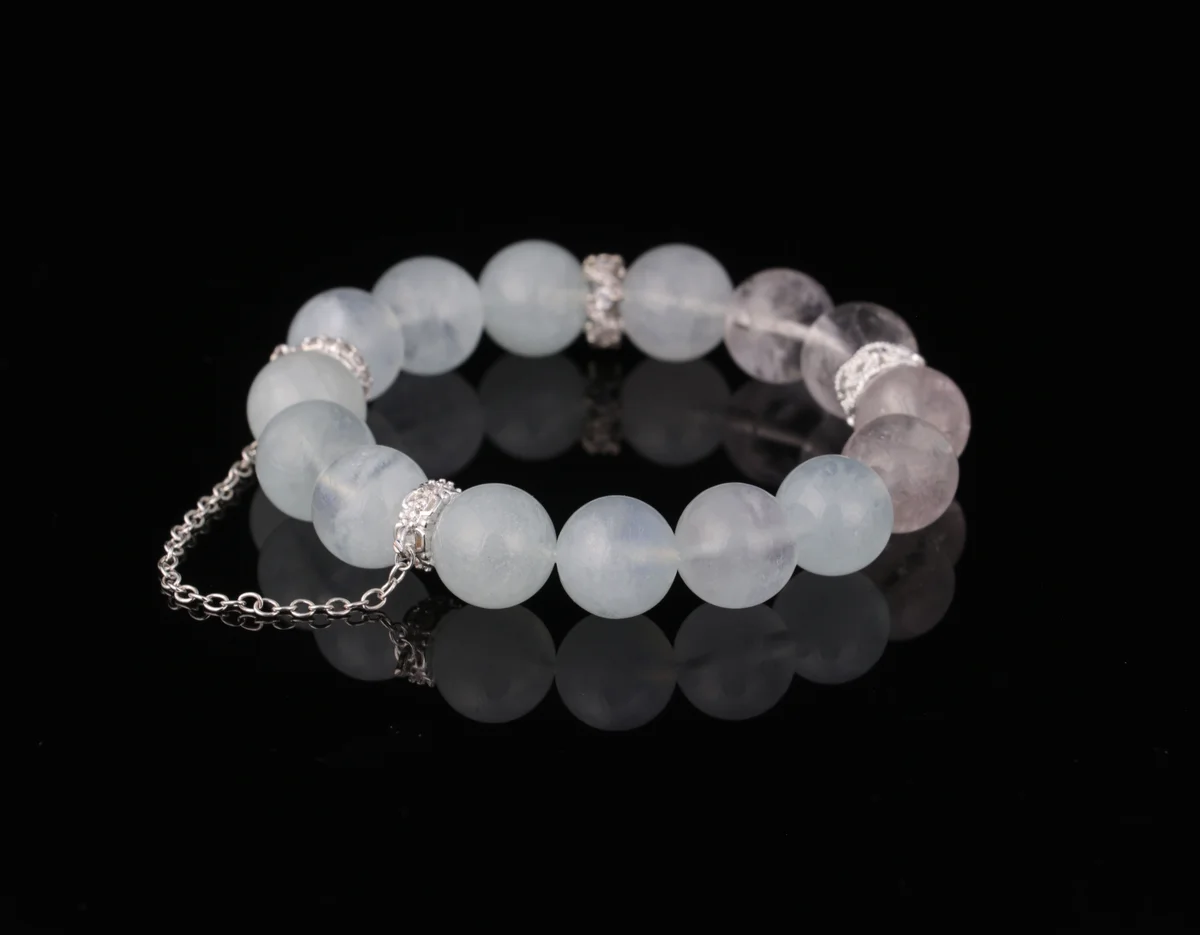 這款手鍊結合了海藍寶和白幽靈兩種天然水晶的能量,具有多重功效。海藍寶主招財納福,能幫助吸引財富和好運;白幽靈則能淨化負能量,清除濁氣。兩者結合形成雙倍能量場,不僅能助你轉運開運,還能有效舒緩壓力、提升睡眠品質,是一款集招財、轉運、助眠、減壓於一體的能量水晶手鍊。